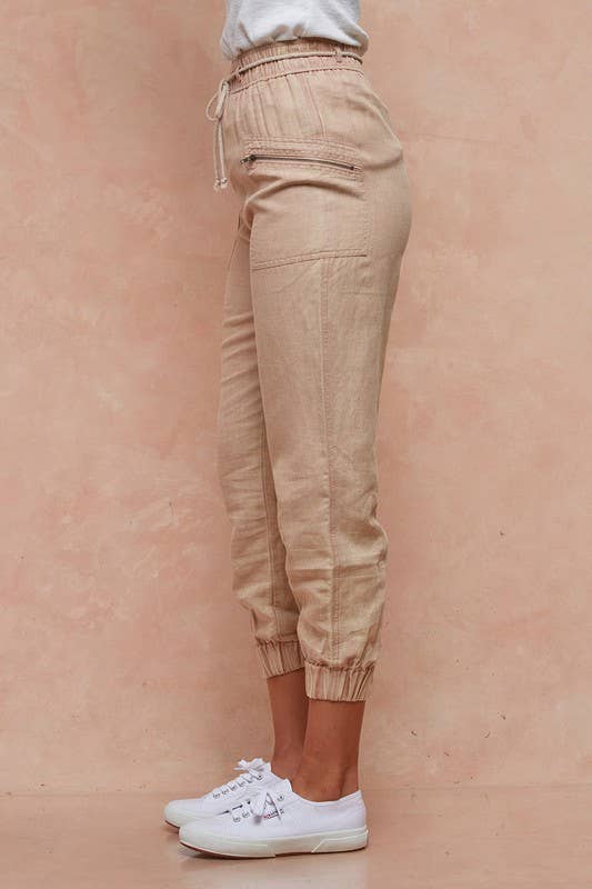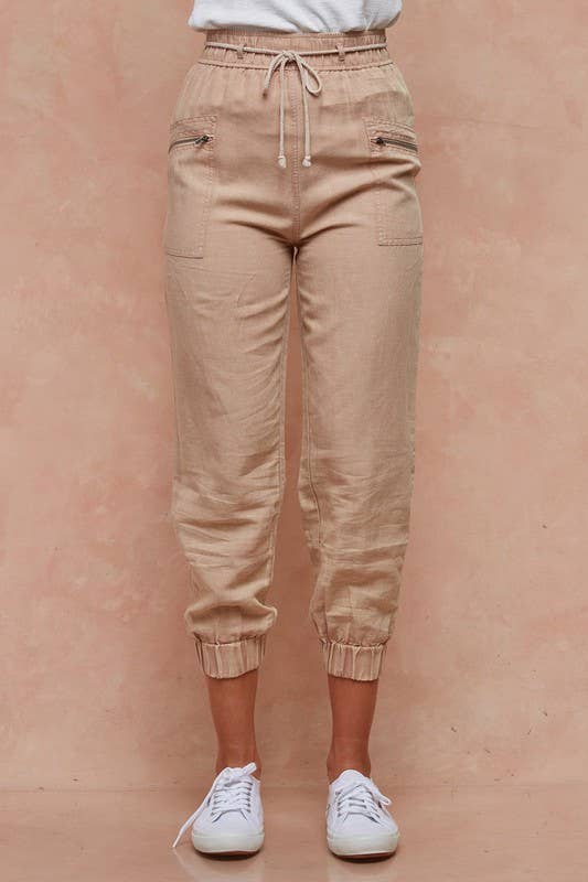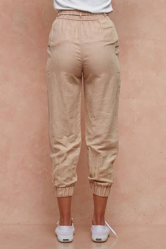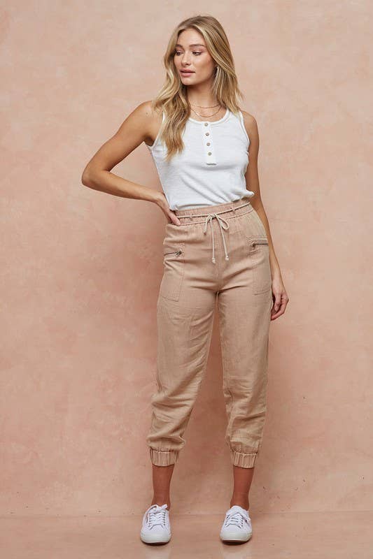 Zipper utility pocket washed jogger with rope belt, , self:50%rayon, 30%linen, 20%tencel, total length 38" | waist 13" | hip 19" | front rise 13", , the model is 5'8" | bust 33" | waist 23" | hips 34" wearing size small.